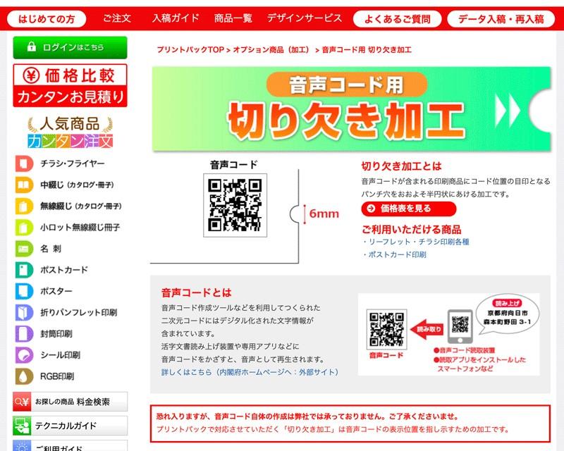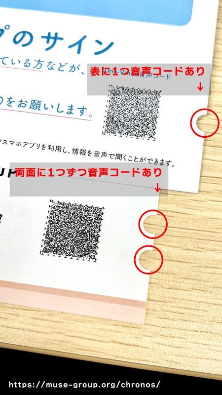音声コードは基本的に印刷物の右下(裏面なら左下)に印刷し、その用紙の表面に対して右下端、コードの近くに半円の切り欠きを1つ(両面印刷なら2つ)つけておかなければなりません。視覚障がい者が指で触れて音声コードの有無を確認でき、読み取りを促すために必要です。